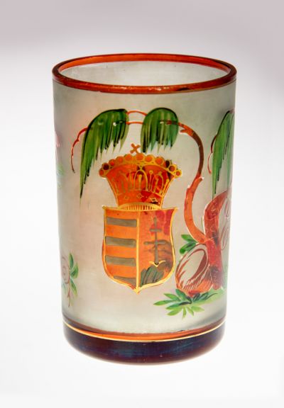 Technika: | aranyozott; formába fúvott; maratott; rézrubin pácolt; színes zománcfestés |