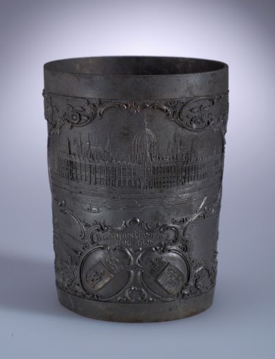 Fölfelé szélesedő, henger alakú pohár, sima talp- és peremszéllel. Teljes felületén kartusokban budapesti látképek: Parlament, Vár, Petőfi-szobor, Lánchíd. Az elején „Budapesti emlék 896-1896" felirat, alatta Buda és Pest címere. Talprészén „törv. védve" pecsét.