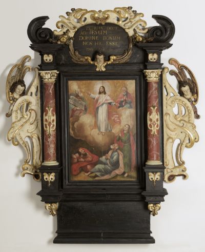 A középkép Krisztus színeváltozását ábrázolja, a felhőkön Mózessel és Illéssel, lent pedig a tanúként jelen levő három tanítvánnyal. Kétoldalt vörösmárványt utánzó kompozit fejezetes oszlop, az oszloptörzs közepén fehér veretdísszel (Beschlägwerk), amely egyszerűbb formában az oszloplábazatokon és a koronázó részen is megismétlődik. A kerethez kétoldalt aranyozott, fehér és lüszteres festésű, fülkagyló-stílusú faragványok illeszkednek, melyek szárnyas angyalfejekben végződnek. A bal oldali faragvány a tábla egykori elhelyezésének adottságait követve enyhén előre hajlik.