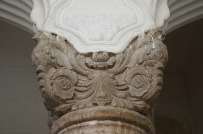 Épületfotó - a Dob utcai elemi iskola (Budapest, Dob utca 85.) lépcsőházának galambokkal díszített oszlopfője