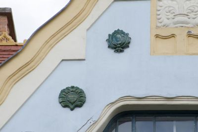 Épületfotó - a gellérthegyi műteremház (Budapest, Kelenhegyi út 12-14.) -a főhomlokzat nyugati sarokrizalitjának oromzati díszítése