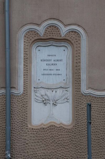 Épületfotó - a Gonda-ház (Budapest, Práter utca 9.) főhomlokzata-az építész emléktáblája
