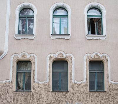 Épületfotó - a Gonda-ház (Budapest, Práter utca 9.) főhomlokzata-földszinti és első emeleti ablakok