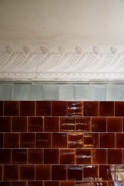 Épületfotó - a Gróf-palota (Szeged, Tisza Lajos körút 20/b.) lépcsőházának földszinti szakasza-a csempe burkolatú fal részlete