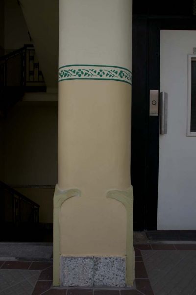 Épületfotó - a Gutenberg-ház (Budapest, Gutenberg tér 4.) melléklépcsője elé nyúló födém tartópillére