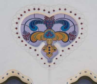 Épületfotó - a kecskeméti Cifrapalota nyugati homlokzatának szélső kerámia dísze az emeleti ablakok között