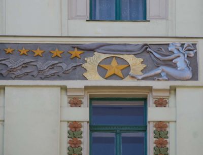 Épületfotó - a Lindenbaum-ház (Budapest, Izabella utca 94.) főhomlokzata a Levegő őselem frízének részletével