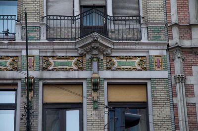 Épületfotó - a Morlin-ház (Budapest, Kossuth Lajos utca 10.) főhomlokzata – a második emelet kerámia konzolos erkélye