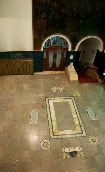 Épületfotó - a Schiffer-villa (Budapest, Munkácsy Mihály utca 19/B.) hallja a bejárati térből a hallba vezető lépcsővel