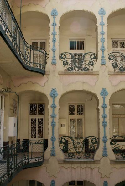 Épületfotó - a Szenes-ház (Budapest, Thököly út 46.) udvari homlokzatának részlete-az utcai lakások előtt húzódó árkádos folyosó és az északkeleti függőfolyosó kapcsolódása