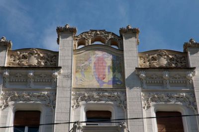 Épületfotó - a Walkó-ház (Budapest, Aulich utca 3.) főhomlokzata-az attika középső része