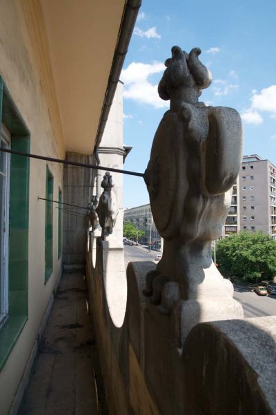 Épületfotó - a X. kerületi állami főgimnázium (Budapest, Kőrösi Csoma út) pártázata az utcai homlokzaton