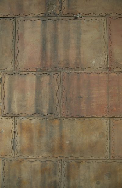 Épületfotó - a Zala-villa (Budapest, Ajtósi Dürer sor 25.) északnyugati homlokzatának pirogránit falburkolata az alagsori szinten