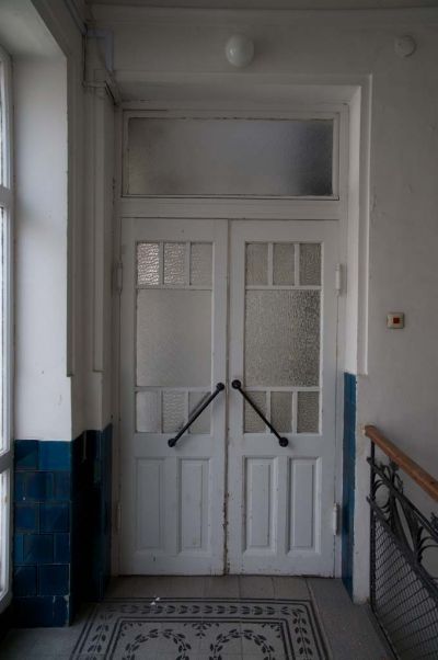 Épületfotó - Korányi Sándor háza (Budapest, Váci utca 42.) -a lépcsőház záró szintje a függőfolyosóra vezető szélfogó ajtóval