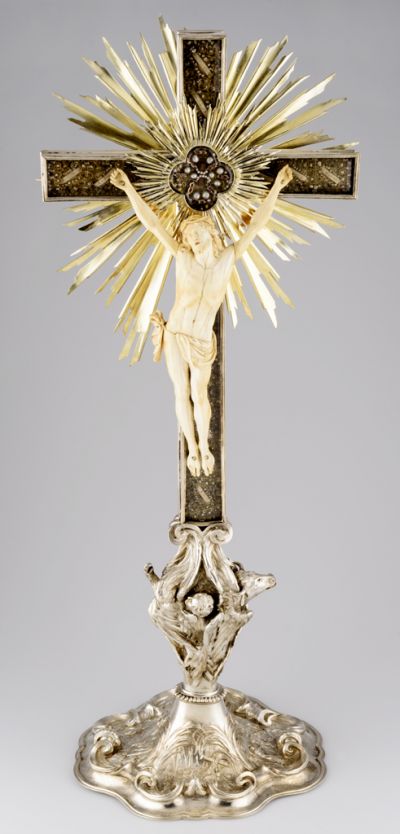 Az üveg alatt ereklyék, gyöngyös és drágaköves polion-díszítéssel. Körben szentek neveit feltüntető feliratos szalagocskák, középen rubinköves és zománcos láncszemecskék és gyöngyfüzérek között a szent kereszt darabkája. Elöl is, hátul is applikált sugárkoszorú. A megfeszített Krisztus figurája elefántcsontból, oldalán megkötött ágyékkendővel. Jegyei a talpperemen és a sugárkoszorú hátoldalán.