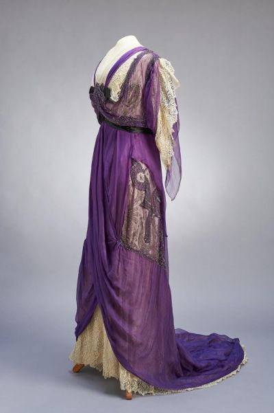 A bemutatott, 1905 táján készült divatos, magas derekú ruha vajszínű selyem alsóruhát rejt, amelyre lágy esésű lila zsorzsett borul, kiemelve a női test vonalát. Az övében hímzés olvasható, mely szerint a bécsi Maison Sitich ruhaszalon trieszti üzletében készült. A két eleje aszimmetrikusan borul egymásra, míg a szoknyarésze hátul uszályos. Gépi csipkével és fodorral díszített és átlátszó üveggyöngyökkel hímzett.