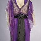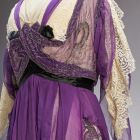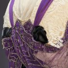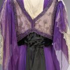 A bemutatott, 1905 táján készült divatos, magas derekú ruha vajszínű selyem alsóruhát rejt, amelyre lágy esésű lila zsorzsett borul, kiemelve a női test vonalát. Az övében hímzés olvasható, mely szerint a bécsi Maison Sitich ruhaszalon trieszti üzletében készült. A két eleje aszimmetrikusan borul egymásra, míg a szoknyarésze hátul uszályos. Gépi csipkével és fodorral díszített és átlátszó üveggyöngyökkel hímzett.