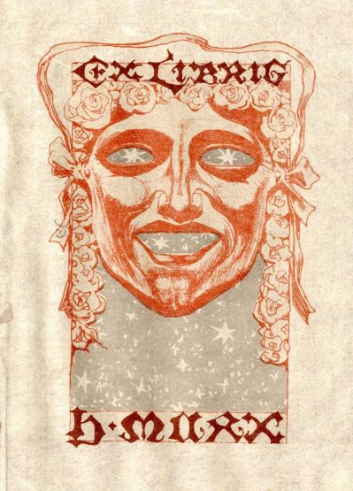 Fritz Erler kevés számú ex libriseinek sajátos típusa a premier planban ábrázolt női portré, virágokkal. E sorozatba illeszthető ez a lap is, noha itt az arc álarccá válik, talán nem véletlenül, hiszen a művész festőként, díszlettervezőként, iparművészként egyaránt alkotott. Műve 1898-ban megjelent a Jugend c. folyóiratban.