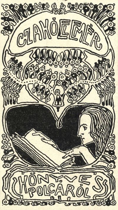Sallangdíszes és mégis sallangmentes ex libris: a díszítmények a teljes absztrakció határáig lecsupaszítottak. Czakó Elemér az Iparművészeti Múzeum tudós könyvtárosa volt, így nem véletlenül került a lap közepére az ex librisek egyik legkedveltebb témája, az olvasó figura – de csak a lényeg, a fej, a kéz és a könyv látható belőle.