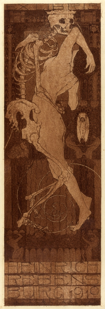 Hasenohr – később felvett művésznevén Hoelloff – eredendően szobrász volt, és a plasztikus formák iránti érzéke ex librisein is megnyilvánult. A barnás alaptónusból szinte kivilágít a női akt, akit a Halált megtestesítő csontváz szorosan magához ölel, jelképezve, hogy mindenki, aki él, halandó, s a Haláltól meg nem menekülhet. Rebensburg, a művész barátja, művészetkritkus volt.