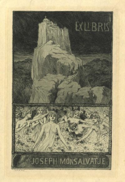 Héroux alapos anatómiai tudás birtokában, biztos kézzel alkotta meg figurális, méretes, ún. luxus ex libriseit, amelyek a gyűjtők örömére szolgáltak, ám könyvekbe aligha kerültek bele. Ezúttal beszélő ex librisről van szó: a híres gyűjtő, Monsalvatje ex librisén a Szent Grál lovagok királya hajdani várát, a mondákban szereplő Monsalvat sziklás hegyének romjait láthatjuk.
