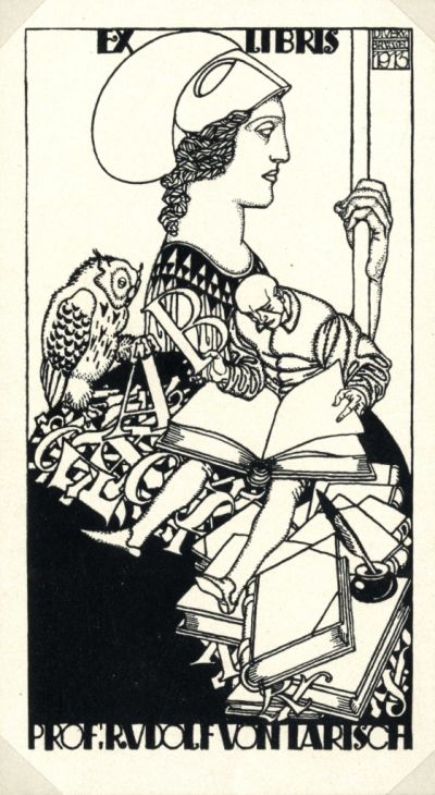 Divéky eredeti gondolatokban, ötletekben gazdag ex libriseinek jellegzetessége a sík felület autonóm kitöltése a valóságtól elrugaszkodó, tetszőlegesen méretezett figurákkal. A háttérben Pallasz Athéné hatalmas félalakja látható, szent állatával, a bagollyal. Az előtérben ülő férfiú betűket válogat, utalva Rudolf von Larischra, aki tipográfus, a bécsi Iparművészeti Iskola tanára volt.