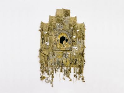 Az egyedi technikával készített kárpit közepén hodigitria-típusú ikon domborított réz borítása látható, amely alatt az arcok helyét fekete alapszövet tölti ki. Az ikont keretként fogja körül a különféle árnyalatú arany és ezüstfonalakból szövött, váltakozó méretű téglalapokból álló, stilizált házformát idéző alapszövet, amelynek szabadon hagyott vetülékei közé – fogadalmi ajándékok (offerek) mintájára – különféle apró fémtárgyakat (rozsdás szegeket, pénzdarabokat, kulcsokat, töltényhüvelyeket, csokoládéformát és egy lehallgató-készülék darabjait) applikáltak. A mű, amely az 1989. decemberi romániai forradalom élményére reflektál, Péreli Zsuzsa ikonparafrázisainak sorába illeszkedik, ám a korábbi művekkel (Gyermekmadonna, Boldogasszony) ellentétben Mária és a Gyermek arca itt nem jelenik meg, a helyüket kitöltő sötét űr elvont anyagtalansága éles kontrasztban áll az ikon köré aggatott, konkrét történelmi helyzetre és egyéni sorsokra utaló tárgyak hangsúlyozott anyagi mivoltával.