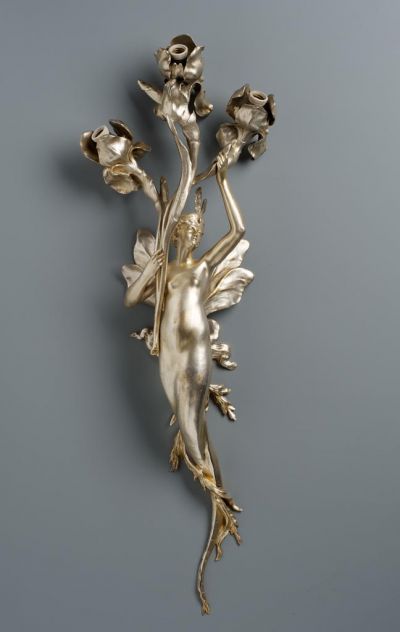 Finoman modellált, szerpentin vonalú női akt kezében sásliliom ágakkal, amelyek végébe az izzókat foglalták. Eredetileg aranyos, ezüstös, zöldes, lilás lüszteres színekben pompázott.