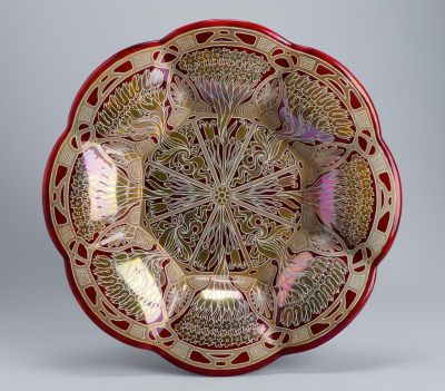 A nagyméretű dísztál nyolckaréjos formáját már az 1887. évi rajzok között megtalálhatjuk (l. I. Façonkönyv, 38. oldalán, 1024. számú rajz). A díszítő motívumok azonban az új művészeti irányzat átvételéről tanúskodnak. Nyolcsugaras osztás szerint a homorú középlapot és a párnásan kidomborodó szegmenseket stilizált vonalrajzos floreális mintázat díszíti, a tulipános és nefelejcsvirágos csokrok egymást váltják, négyszeresen ismétlődve. A rézoxidos rubinlüszter alapon az ezüst és platinaoxiddal elért sárga, szürke árnyalatok igen látványosak, a legvilágosabb kontúrvonalakat a redukciós égetés hatásától védő fedőrajzolattal érték el. A szegélydísz geometrikus mintázata egyértelművé teszi, hogy a dekoráció német előkép nyomán készült.