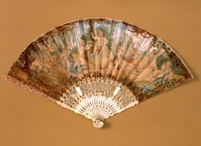 Huszonegy darab áttört és festett elefántcsont küllőn gouache festésű papírlap. A küllőket gyöngyház alátétes sárgaréz szegecs fogja össze.
