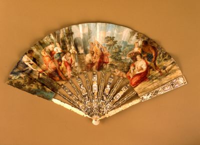 Tizenhárom darab áttört, arany- és aranyozott ezüstfóliával díszített csontküllőn akvarellel festett pergamenlap, a l’anglaise összeállításban. A küllőket gyöngyház alátétes sárgaréz szegecs fogja össze.