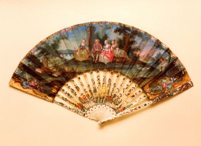 A háttérben ház, a távolban híd, a folyóparton, háttal álló, vizelő(?) férfialak. A hátlapon, sziget közepén, pásztorlány ül magányosan. A küllőkön virágok között, középen hölgynek bókoló gavallér, mögötte társa és terített asztal, a hölgy mögött kutyával játszó gyermek látható. A záróküllőkön virágok és szerelmi jelvények között pásztorlányka ül. A számos, hasonló típusú legyező közül a Bayerisches Nationalmuseum egyik legyezőjével mutat rokonságot.