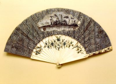 A grisaille festésű lapon a tapétaszerű, hullámvonalas és hullámzó virágos ágas, chinoiserie díszítményt középen szabálytalan alakú, vízszintesen elnyúló medalion szakítja meg. A medalionban háromszereplős – két hölgy és egy férfi – kerti idill. A hátlapon apró sziget látható, fákkal és fakorláttal. A kinyitva összefüggő felületet adó küllőkön szürke és kék színű virágindák. A záróküllők felső részén virágok között pagoda áll. Az elnagyolt festésmód és egyszerű kivitelezés rokonítja a Bayerisches Nationalmuseum és a bostoni Museum of Fine Arts gyűjteményében őrzött darabokkal.