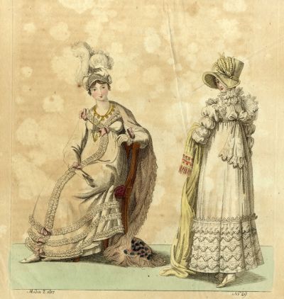 Divatkép - egy széken ülő és egy álló nő fehér ruhában, melléklet, Wiener-Moden-Zeitung und Zeitschrift für Kunst schöne Literatur und Theater