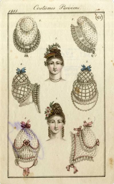Divatkép - hajviseletek, kalapok, főkötők, melléklet, Journal des Ladies et des Modes, Costume Parisien