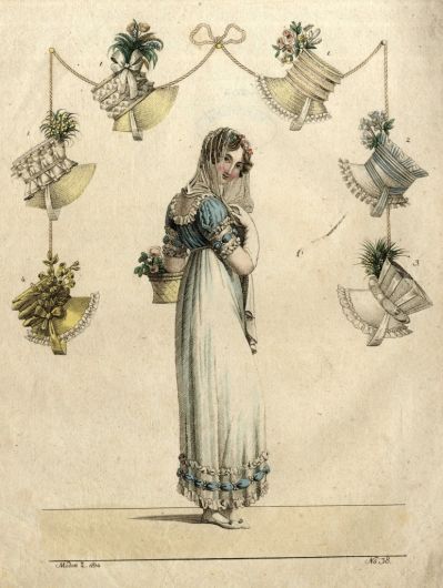 Divatkép - kék-fehér ruhás nő különböző kalapmodellekkel, melléklet, Wiener-Moden-Zeitung und Zeitschrift für Kunst schöne Literatur und Theater