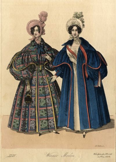 Divatkép - két nő, az egyiken kockás, növényi mintás, a másikon kék köpeny, melléklet, Wiener Zeitschrift für Kunst, Literatur, Theater und Mode