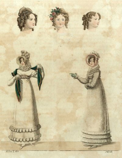 Divatkép - két nő fehér ruhában és három frizuramodell, melléklet, Wiener-Moden-Zeitung und Zeitschrift für Kunst schöne Literatur und Theater