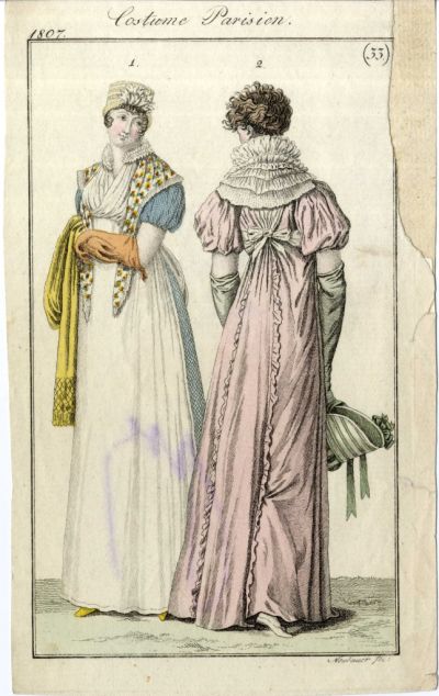 Divatkép - két nő, kék-fehér betétes, illetve rózsaszín ruhában,melléklet, Costume Parisien