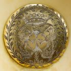 A fedél belsejében elhelyezett aranyozott ezüstlapon az Esterházy-címer látható: a kettős címerpajzsban egy-egy egymással szemben álló griff helyezkedik el, egyik mancsukban három szál virágot, a másikban kardot tartva. A kettős címerpajzs mellett kétoldalt C. P. E. D. F., illetve C. U. E. D. F. betűkből álló felirat (Comes Paulus Esterházy de Frakno, illetve: Comitissa Ursula Esterhazy de Frakno). A kupa tehát Esterházy Orsolya és Esterházy Pál házasságának ideje alatt, 1655–1682 között készült.