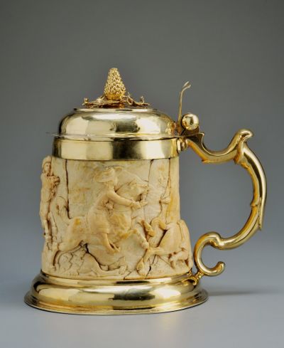 A faragott elefántcsont dombormű sokalakos lovas csatajelenetet ábrázol. A fedél plasztikus dísze: öntött szőlőfürt, levelekkel. A faragott relief a XVII. század utolsó két évtizedében Schwäbisch Gmündben működött Johann Michael Hornung (1646-1706) hasonló típusú alkotásaival rokonítható, s Christian Theuerkauff szíves szóbeli közlése szerint feltételesen e mesternek tulajdonítható.