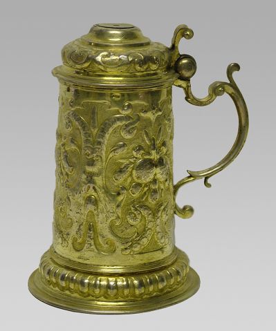 Kerek, lépcsőzetes talpperemén bordás díszítés. Hengeres teste felfelé kissé szűkül, rajta trébelt maszkaronok között gyümölcsök és kígyófarkak. Füle kérdőjel alakú. Forgópánttal záródó tagolt fedelén poncolt alapon trébelt díszítés: kartus motívumok. Fedelének közepéről hiányzik a fogógomb.