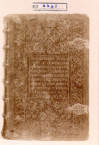 Fénykép - Brandenburgi Katalin a ”Serenissima principissa... „ kezdetű feliratos könyve, bőr, sajtolt és aranyozott díszű, XVII. sz., Iparművészeti Múzeum