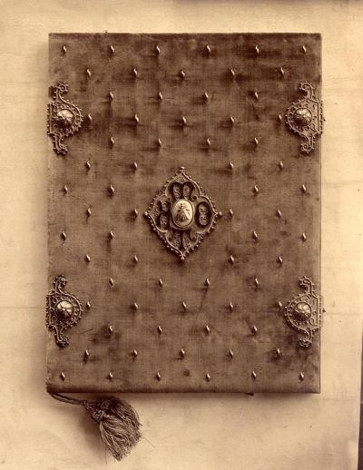 Fénykép - díszalbum hátoldala, bársony, fém szögekkel és zománcdíszes áttört fém rátétekkel, középen méh, körülötte MOKT betűk, magyar