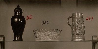 Fénykép - díszedény, keménycserép, Bayreuth, XVIII. sz.; kosár, keménycserép, Pápa, 1810-1832 és korsó, kőcserép, délnémet, XVII. sz., IV-V. Ernst Aukció