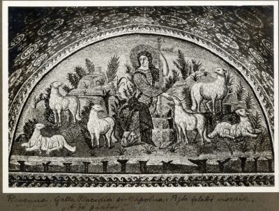 Fénykép - Galla Placidia mauzóleuma, az ajtó feletti Jó Pásztor mozaik