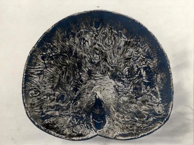 Fénykép - páva-tál, majolika, Hans Stoltenberg-Lerche műve, Iparművészet Múzeum