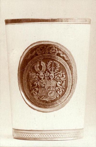 Fénykép - pohár, tejüveg színes zománcfestéssel, oldalán főnemesi címer, cseh, XVIII. sz. vége