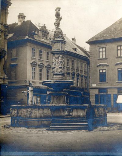 Fénykép - Roland (más néven: Miksa) szökőkút, készítette: Lutringer András kőfaragó, tetején II. Miksa (1563-1576) magyar király páncélos lovagként ábrázolt szobra áll, 1572 után