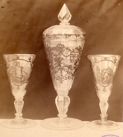 Fénykép - talpas poharak arany díszítéssel, és fedeles serleg, üveg, metszett arany díszítéssel, cseh, XVIII. sz.